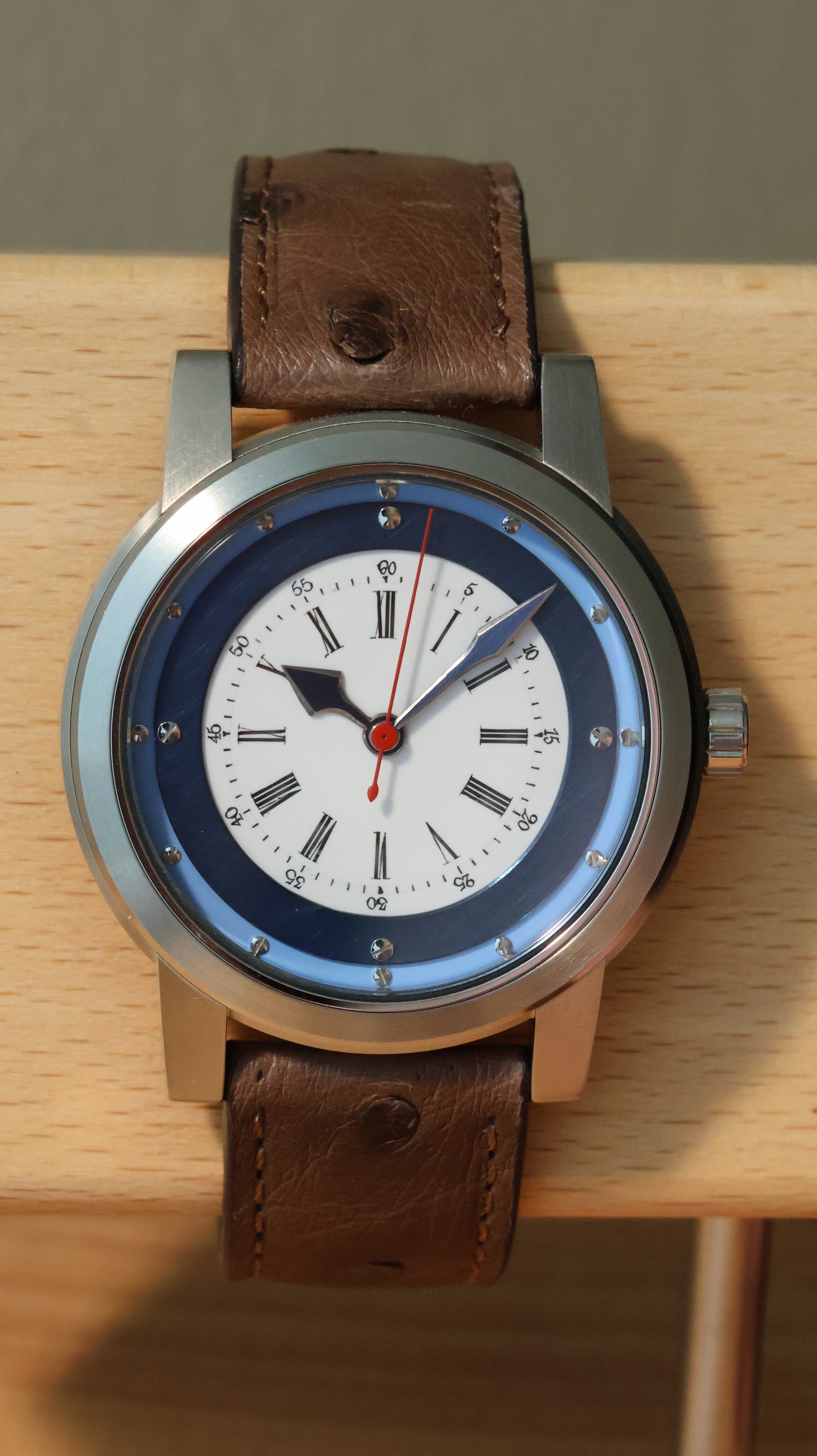 Zifferblatt: Das Emaillezifferblatt stammt von einer ca. 130 Jahre alten Taschenuhr. Lünette in Stahl, mattiert, gebläut, handbemalt