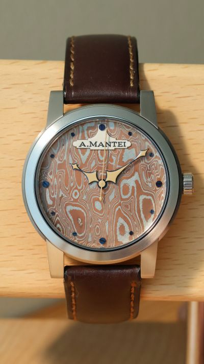 Zifferblatt: Mokume Gane, 925/- Sterling Silber Schild, handgesägt, gefeilt, angliert, bemalt