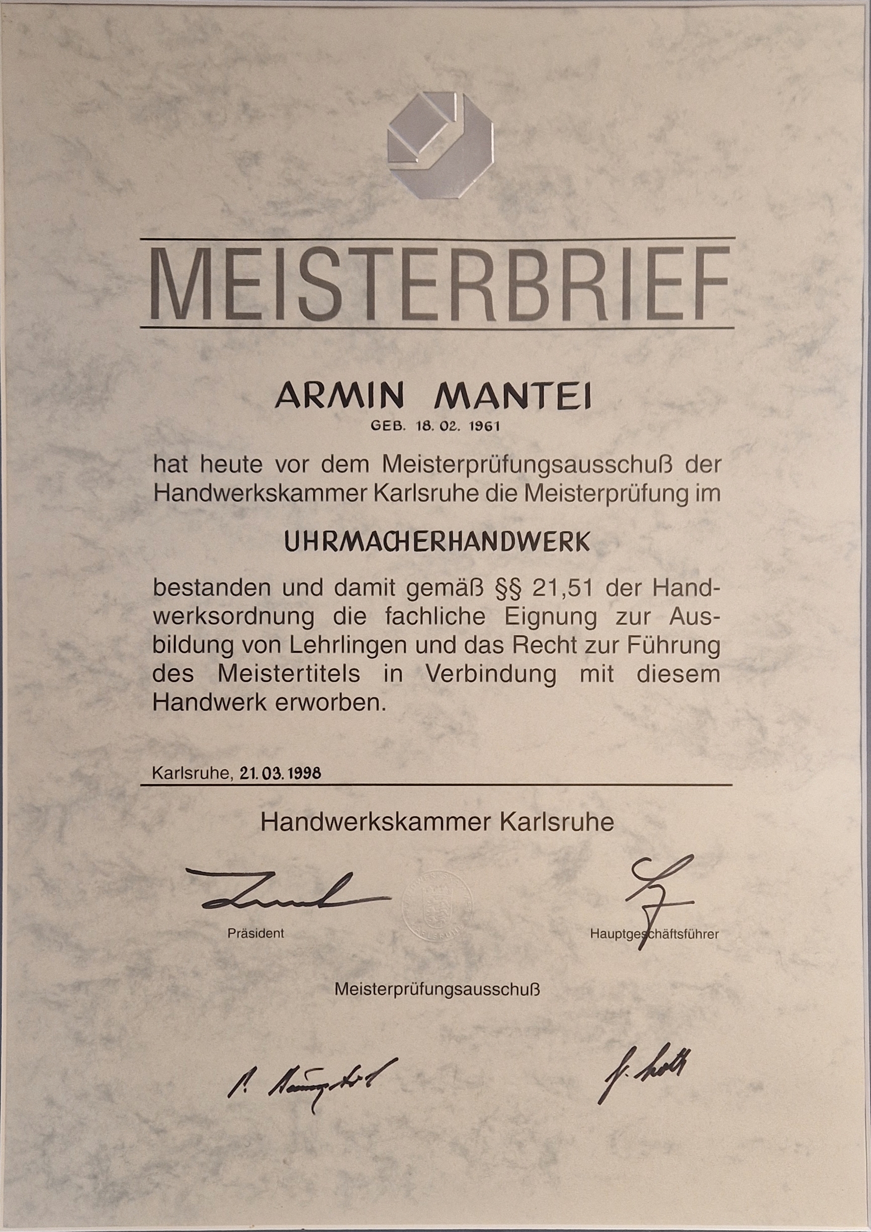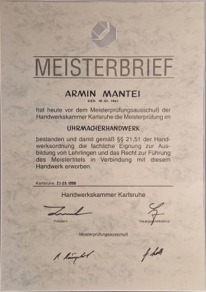 - Die erforderlichen umfangreichen Schulungen bei der Swatch Group in Pforzheim mit anschließenden Prüfungen habe ich durchgeführt und bestanden und unsere Werkstatteinrichtung mit Maschinen, Einrichtungen und Werkzeugen erfüllt den aktuellen Stand und die Anforderungen der Swatch Group.