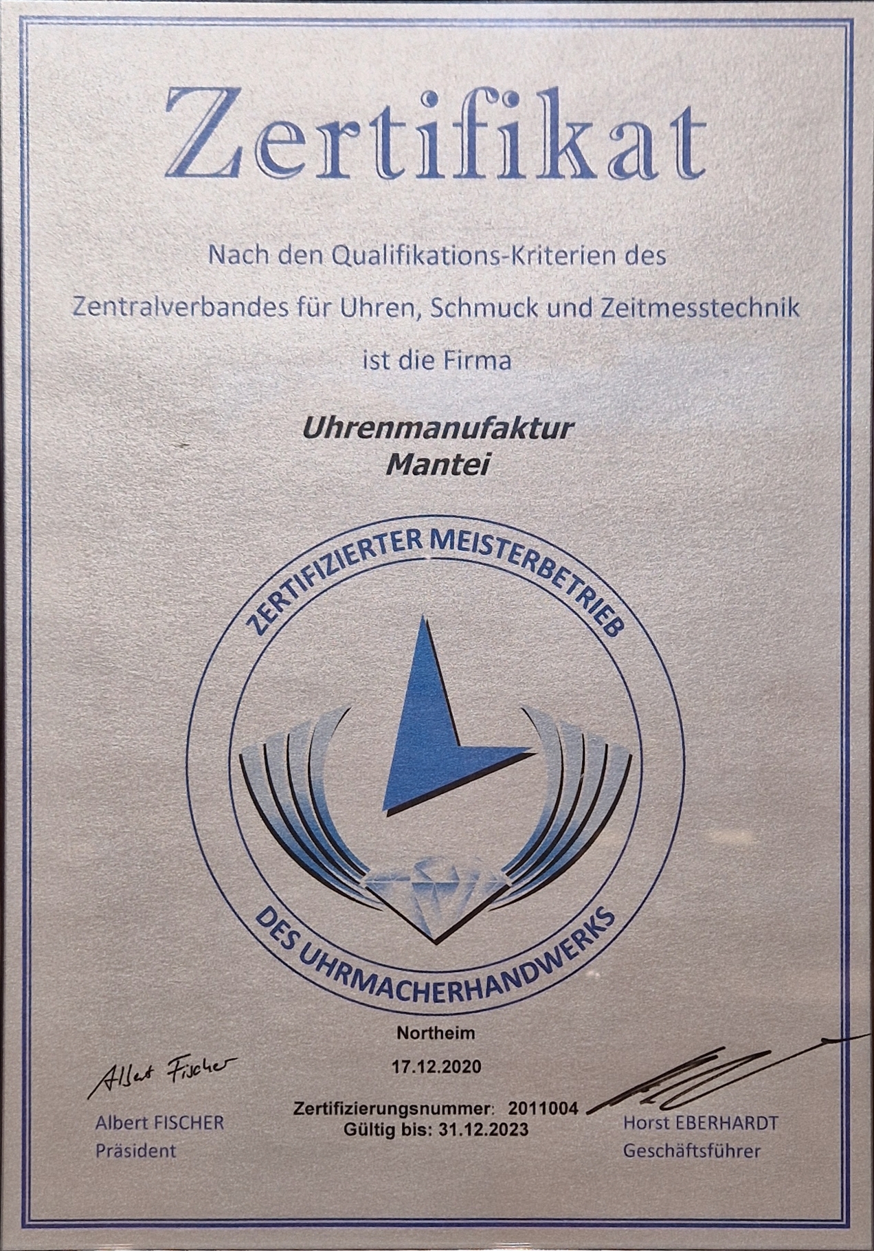 - Seit 2011 sind wir vom Zentralverband für Uhren, Schmuck und Zeitmesstechnik zertifiziert und haben uns verpflichtet nach den entsprechenden Vorgaben als qualitätsbewusster und serviceorientierter Fachbetrieb zu arbeiten.